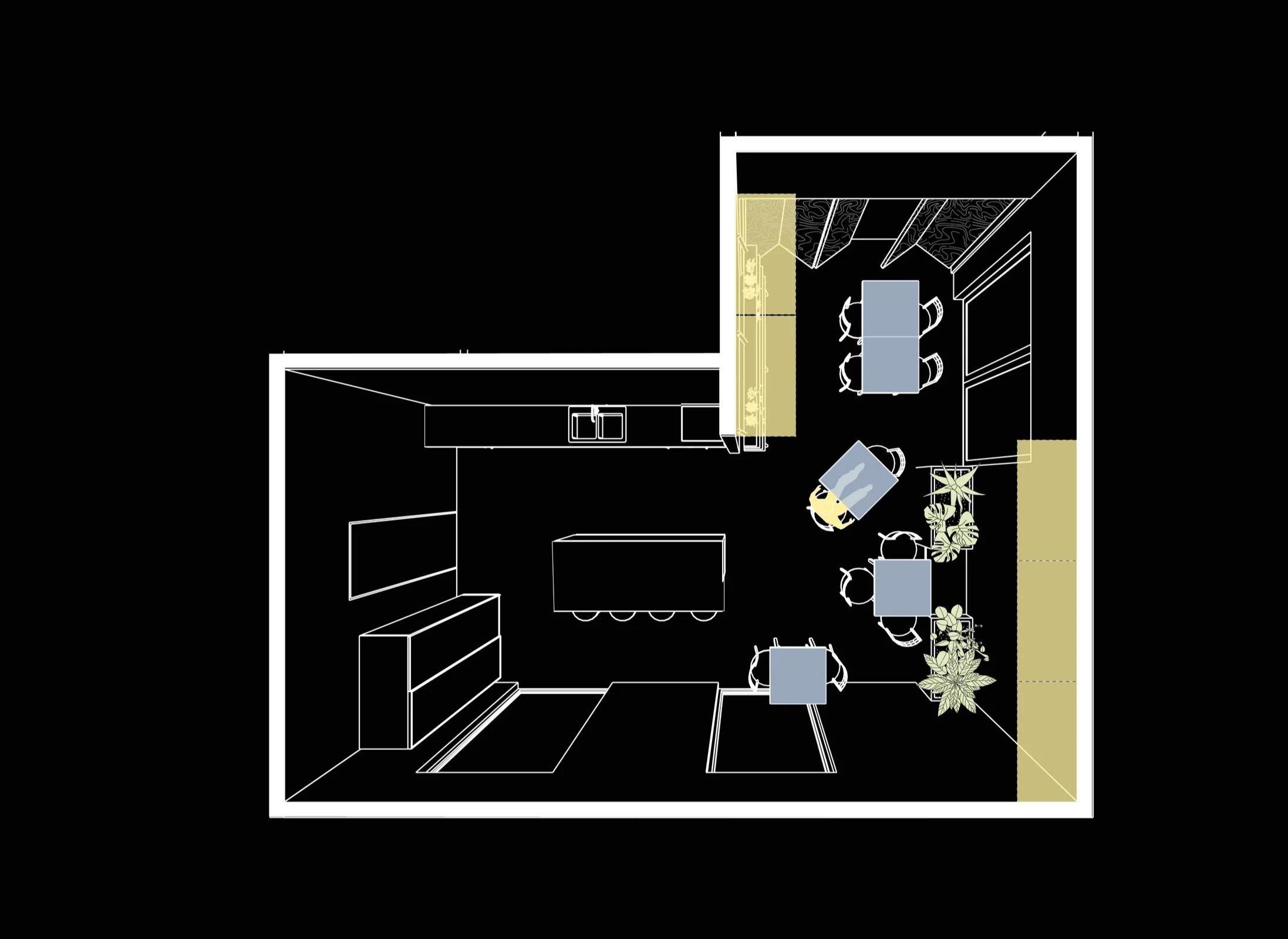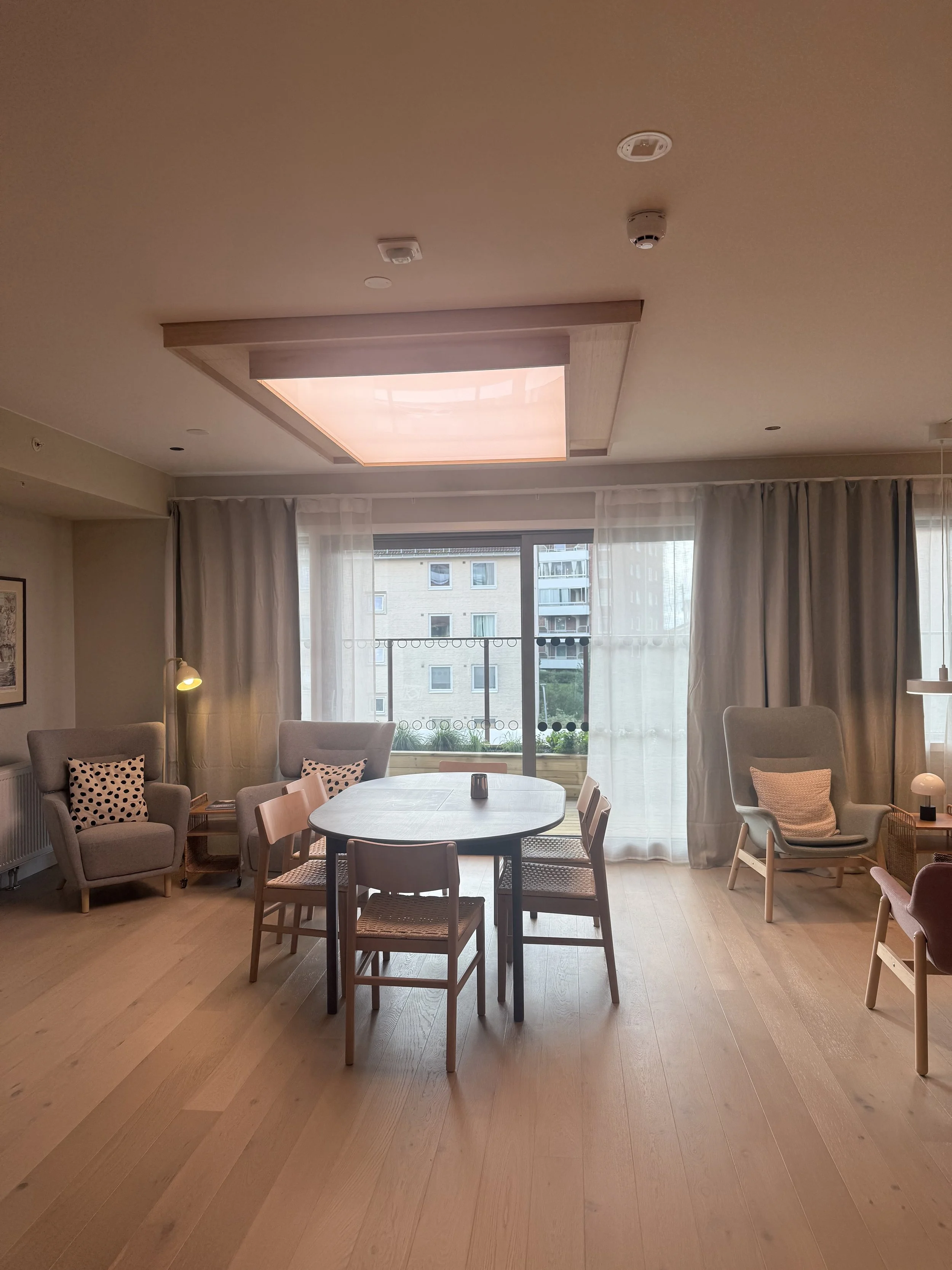 Senior Bølgelengden is currently under construction and will serve as a residence for many seniors in Oslo. Among its many rooms, two key spaces where residents are expected to spend a significant amount of time are the library and kitchen. Despite these areas having windows and a connection to a garden on the first floor, the client recognized the necessity for a backup source of natural sunlight. This consideration was driven not only by the potential benefits for this age group but also due to the long winter months in Oslo. Therefore, the strategic placement of lighting facilitated the creation of a sitting area around the lighting in the library. Similarly, for the kitchen, it allowed for the inclusion of plants and herbs, enhancing the overall environment of the room.