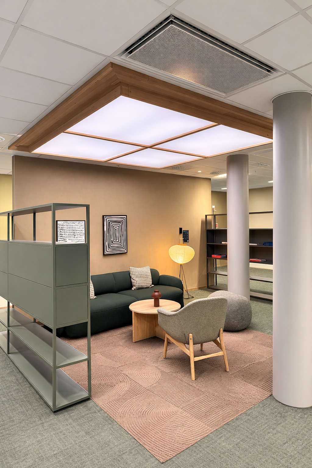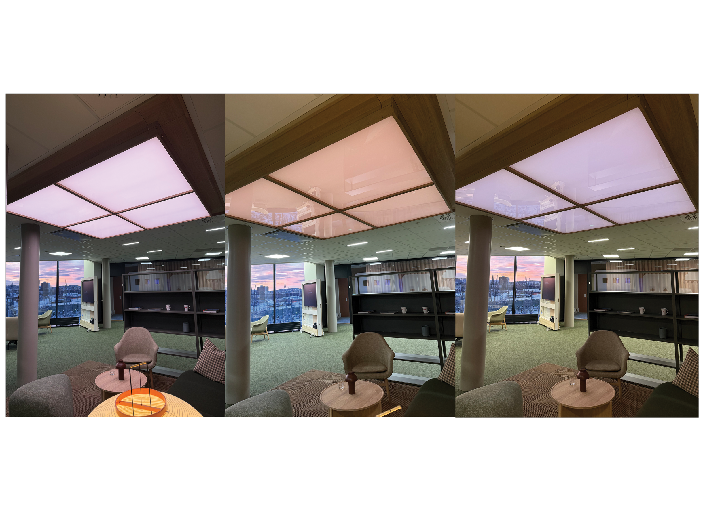 The INCUBE LIGHTING installation is located on OBOS’s floor, in the pause area overlooking Ulven. Here, OBOS employees can enjoy a cup of coffee while experiencing a simulation of Barcelona’s sunlight, giving them an extra dose of energy to start the day. They can also have quick discussions or hold informal meetings under the skylight instead of in traditional, darker meeting rooms.